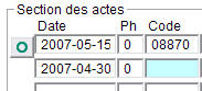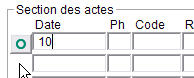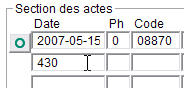 Dans les champs de date, on peut ne mettre que le jour ou le mois et le jour, et MED-Office sélectionne alors le mois ou l'année courante. Par exemple, si on est en mai 2007 et qu'on écrit 14, la date 2007/05/14 sera sélectionnée automatiquement. Si on met 405, le 2007/04/05 sera sélectionné.