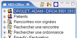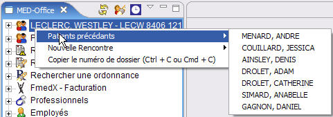 Chaque fois que l'utilisateur sélectionne une donnée qui permet d'identifier un patient, les données du patient en question s'affichent dans le menu de navigation. Que ce soit à partir d'une liste de recherche (patient, rencontre, rappels, etc.) ou d'un éditeur (fiche patient, rencontre/ordonnance, etc.).