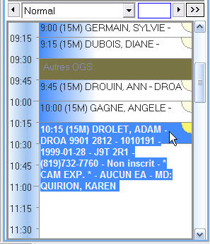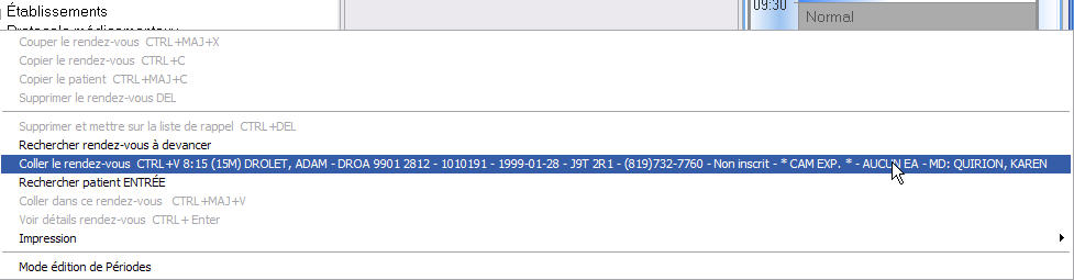 Nous avons ajouté un nouvel item correspondant au patient actif dans le menu de navigation principal. Ainsi, dès qu'un item appartenant à un patient est sélectionné (un rendez-vous, une rencontre, une ordonnance, sa fiche-patient, son nom dans une liste de recherche), ce nouvel item affiche alors les données du patient. Selon l'environnement de travail et les privilèges utilisateur, vous y verrez les rendez-vous, les rencontres et les documents numérisés. Voici des exemples de cette nouvelle fonctionUn rendez-vous est sélectionné dans l'horaire.