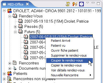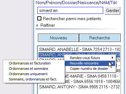 Grâce à ce menu, il est plus facile de créer une rencontre ou de consulter les rendez-vous futurs sans ouvrir la fiche du patient.