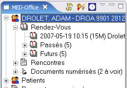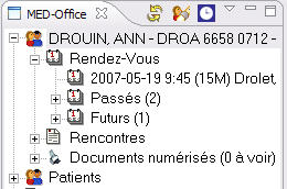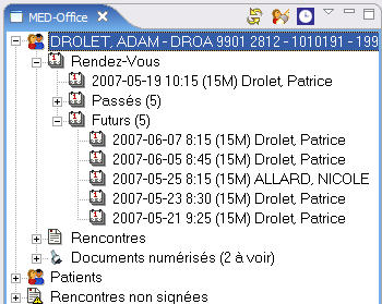 On peut ouvrir cet item pour accéder aux menus liés des rendez-vous, des rencontres et des documents numérisés (selon l'environnement de travail et les droits de l'utilisateur). Notez que maintenant on affiche le nombre de documents numérisés à voir, tout comme le nombre de rendez-vous passés et futurs.