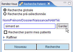 On peut entrer le numéro de dossier, le NAM (ou son début) ou le nom et prénom (ou seulement les lettres initiales de ces données). La touche TAB lance la recherche automatiquement. Si un seul patient correspond aux données saisies, il est immédiatement choisi. Si plus d'un patient satisfait les critères de recherche, la fenêtre de sélection s'ouvre et permet de faire le bon choix.