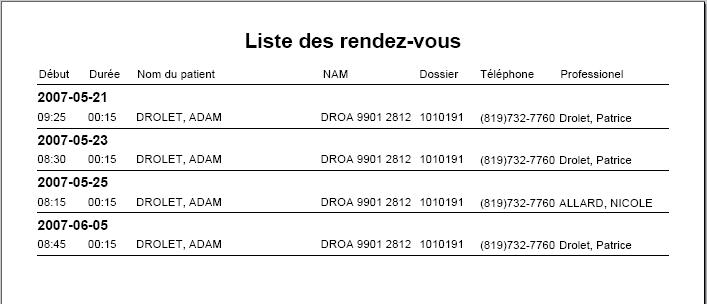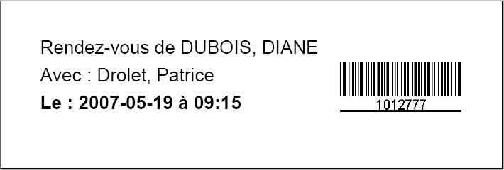 Un nouveau rapport permet d'imprimer le rendez-vous actif ou la liste des rendez-vous futurs du patient ayant le rendez-vous sélectionné. Il est même possible d'imprimer un code-bar représentant le numéro de dossier du patient (ou son numéro d'assurance-maladie).