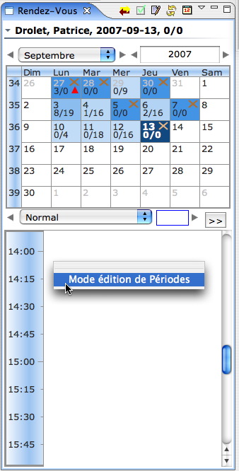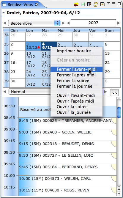 Parfois il est nécessaire de fermer une période et d'en déplacer les rendez-vous. Cette nouvelle fonction peut être appliquée directement sur une période de rendez-vous (voir section précédente - l'option "Période fermée" de la fenêtre des propriétés des périodes). Une méthode très rapide permet de fermer une période à partir du menu contextuel du calendrier. Notez qu'il est possible d'ouvrir une période qui avait été fermée.