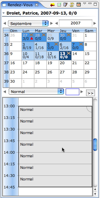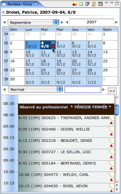 Une période fermée assigne à tous les rendez-vous de cette période le statut "A déplacer". Notez que tous les rendez-vous "A déplacer" ont un triangle rouge pour en aviser rapidement l'utilisateur. Le même triangle est aussi affiché dans le calendrier si au moins un rendez-vous d'une journée est à déplacer.