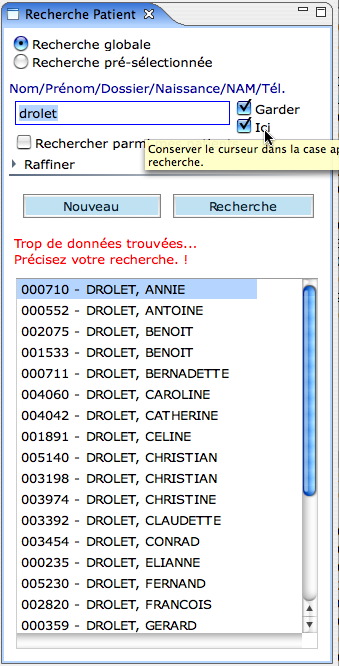 Une nouvelle option à la droite de la case ("Ici") conserve le curseur dans cette case après une recherche. Cela permet d'éviter à recliquer constamment dans la case de recherche quand on veut simplement chercher un patient pour obtenir une données déjà visible dans la liste.